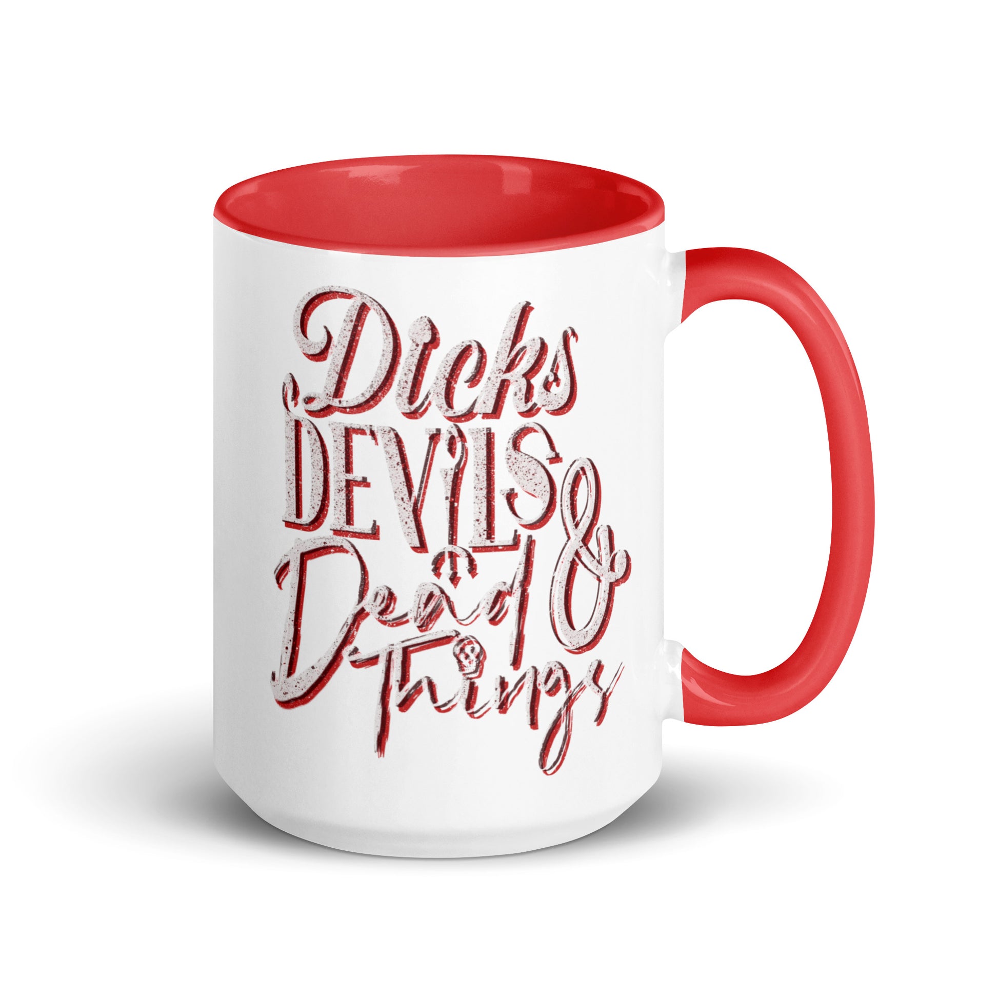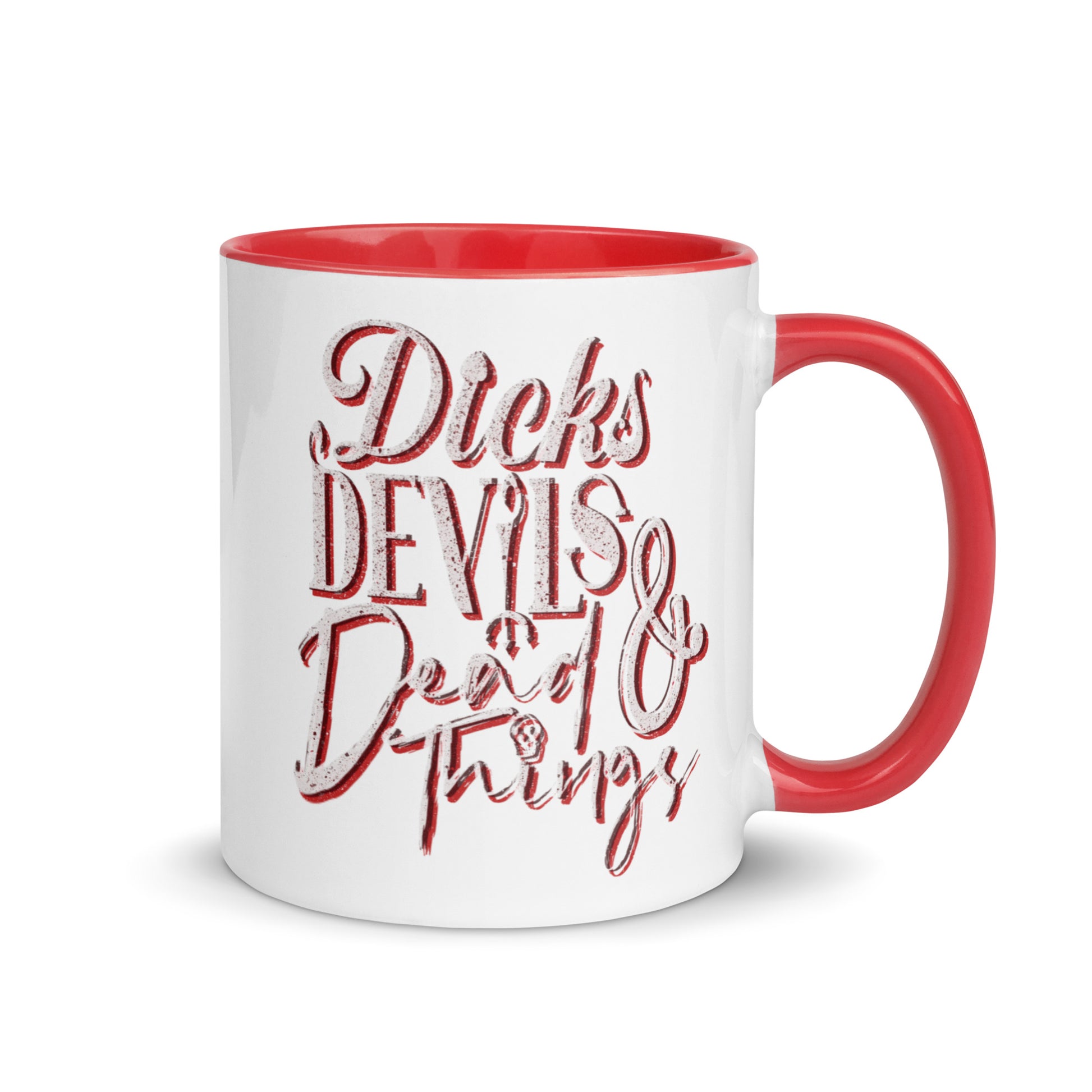 Start your day with a sip of chaos—our ‘Dicks, Devils, & Dead Things’ mug, complete with devilish red inside.